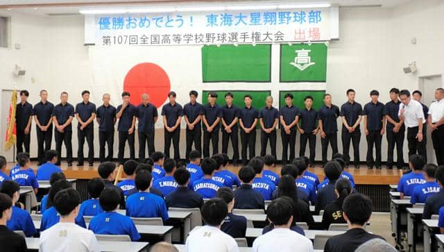 一人ひとりが決意表明。決勝で先制の適時二塁打を放つなど2打点の活躍をした主軸の堀田延希選手は「チームの勝利に貢献できるプレーをする」と誓った。八回途中に登板してピンチをしのいだ緒方龍之介投手も「一つひとつ勝ち上がる」と約束した。