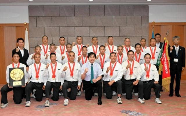 西野貴裕監督は「石川大会の決勝では、たくさんの応援に支えられて、粘り強い戦いができた」と報告。田西称(とな)主将(3年)は、「甲子園大会では、昨年のベスト16の壁を破って、チーム目標である甲子園優勝をしたい」と決意を述べた。