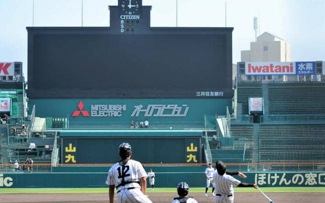 石井斗弥(とうや)遊撃手(2年)は、「思っていた以上に外野が広い。球場の広さに負けないようにプレーしたい」。控えの右腕・丹羽晄基(こうき)投手(3年)は「スタンドが高いので、低い所で投げている感じ。試合では、自分のよさであるテンポを大切に投げたい」と話していた。(本井宏人)