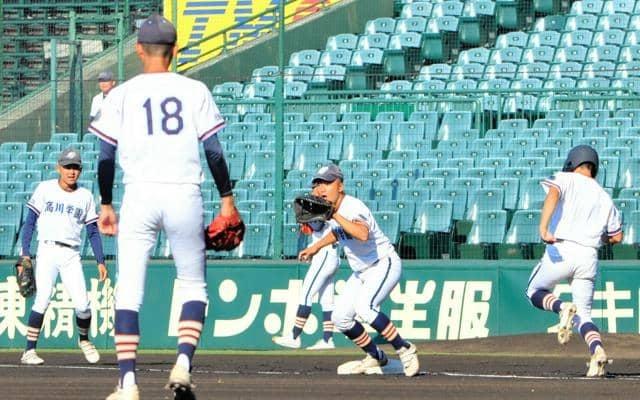 5日に開幕する第107回全国高校野球選手権大会に県代表として出場する高川学園が2日、兵庫県西宮市の阪神甲子園球場で初の練習に臨んだ。聖地の土を踏みしめた選手たちは守備練習に汗を流し、球場の特性などを確認した。