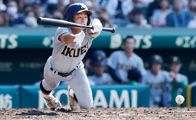「絶対に決めてやる」。四回1死二、三塁、3球目。バントの構えを見せた砂涼人選手(1年)は身を乗り出し、倒れ込みながら外に外れたスライダーをバットに当てた。打球は一塁側に転がりスクイズは成功。貴重な2点目を挙げた。
