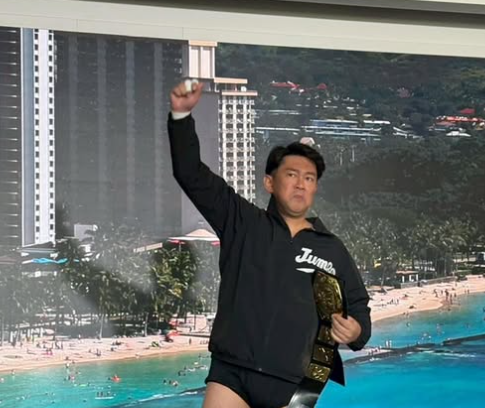 投稿文には「ジャンボ鶴田inハワイ」「オー!オー!オー!」と力強い掛け声が添えられており、全日本プロレスのレジェンド・ジャンボ鶴田を意識した演出と思われる。