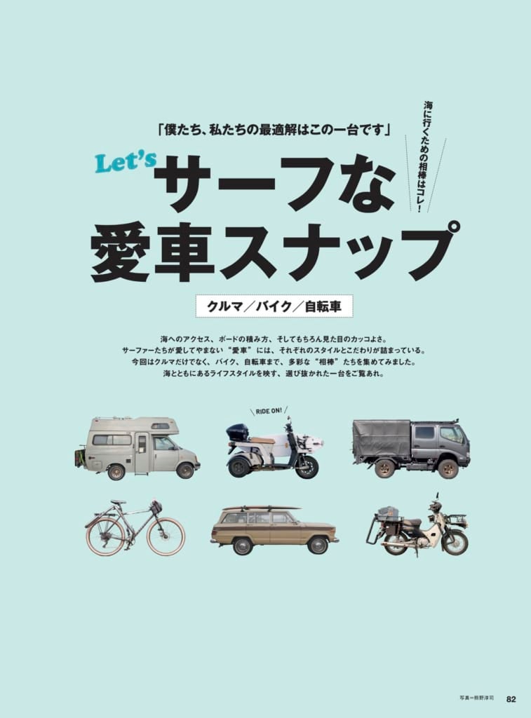 海へのアクセス、ボードの積み方、そしてもちろん見た目のカッコよさ。サーファーたちが愛してやまない“愛車”には、それぞれのスタイルとこだわりが詰まっている。今回はクルマだけでなく、バイク、自転車まで、多彩な“相棒”たちを集めてみました。海とともにあるライフスタイルを映す、選び抜かれた一台をご覧あれ。