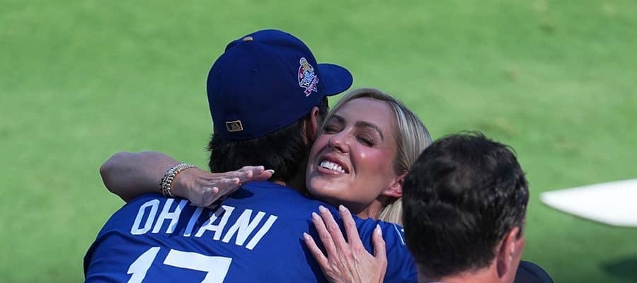 この日、ウエストンさんはドジャース戦に合わせてか、肩を出した青いドレスで登場。大谷とがっちりハグをすると、その後は記念撮影をしていた。(Full-Count編集部)