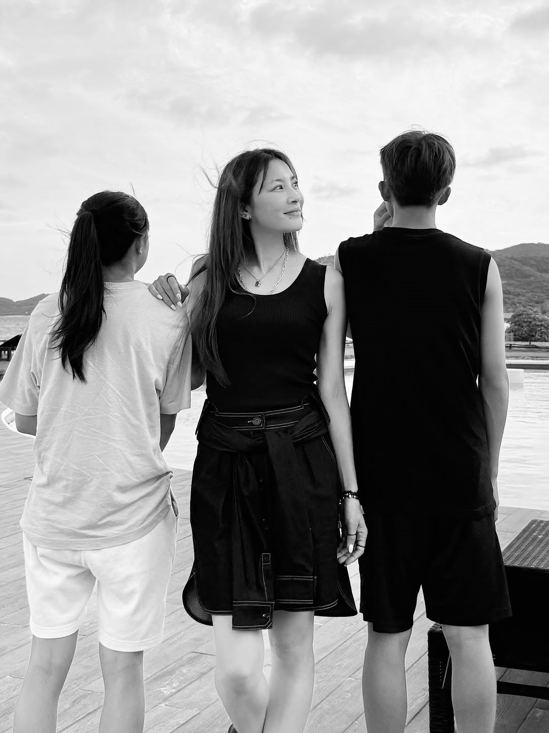 モノクロに写し出されている海辺でのショットには、成長著しい子供たちと並び立つ様子を公開。親子の絆と時の流れを感じさせるショットである。