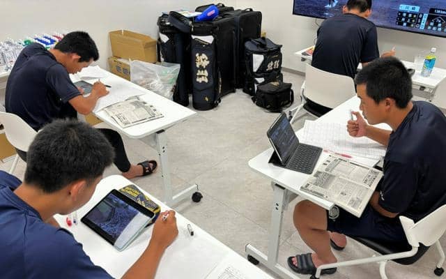 宿舎の一室で対戦相手の映像などを見て、投手や打者の特徴などを分析。その結果を試合に臨む選手たちに伝える。