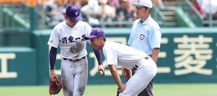兵庫県に熱中症警戒アラートが発令される中での試合となった13日。気温もどんどん高くなった第2試合では、関東第一が2点をリードした6回、守備に就こうとした越後駿祐主将(3年)が足をつり途中交代した。