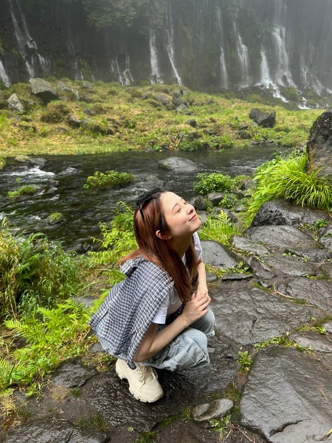 加藤乃愛、滝を背に満面の笑み 自然の中でリフレッシュ