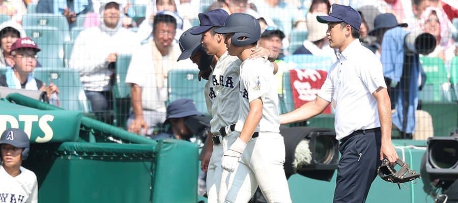 連日の酷暑に見舞われる甲子園。この日も30度以上を超える気温となった。第3試合は初出場となった綾羽と春夏連覇を目指す横浜が相まみえ、7回までに横浜が3-1とリード。8回に2点を加えた。その時だった。二塁手の経免が左足をつったようで、フィールド上で倒れ込み、場内は騒然とした。