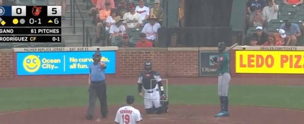 6回表・マリナーズの攻撃、1死一塁の場面で打席に立った3番のフリオ・ロドリゲスに対して菅野は、初球、外角へと投じた144km/hのカットボールで見逃しを誘い、ストライクを先行させることに。しかし、ここで突如として雨脚が強くなると、ボールを握ることもままならぬ状態となったことから、菅野はタイムをとってロジンバックに手をやることとなった。しかしセットポジションに入ってからも雨脚は強くなる一方。菅野がなかなか投球に入れないでいると、それを見た球審はピッチクロック違反を宣告。すると、この判定に、ベンチのトニー・マンソリーノ暫定監督は激怒。ベンチから飛び出し、この雨でどうしろというのかと言わんばかりに抗議することとなった。結局、その後、雨脚は強くなる一方であったことから、試合は中断することとなったが、そもそも通常のプレーが行えないような状況下で、菅野をピッチクロック違反としたことに、ファンからは「これは酷いw」「プレーできないだろ」「豪雨すぎるw」「見えねえ」「制球命の投手にこれは酷だわ」「そりゃキレる」「菅野さん気の毒やな」といった様々な反響が巻き起こることに。