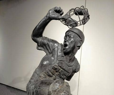 その後、歴史館と交渉を続け、今年4月に1体を常設することを認めてもらった。枚方市内の企業や個人と一緒に「光を当てる会」をつくり、後逸した捕手の原形を元にしたブロンズ像をつくって寄贈することにした。