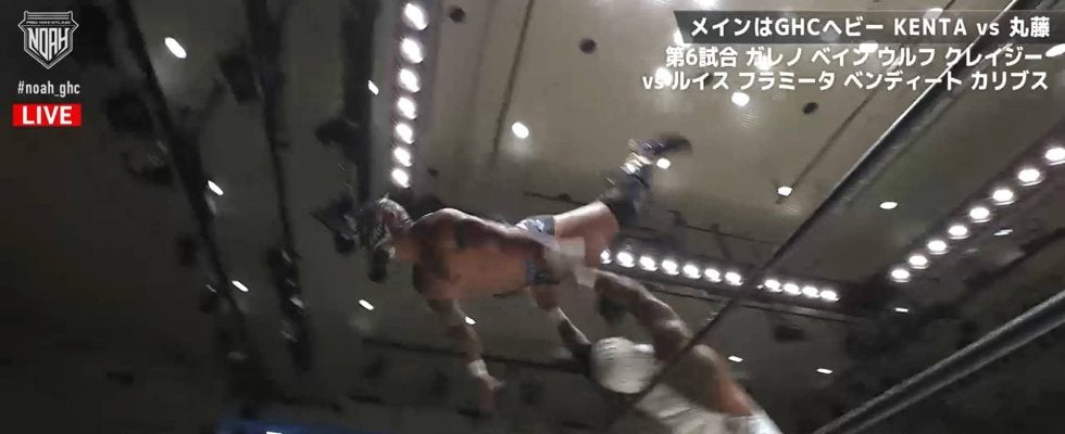 だが本当の“レベチ”はここからだった。兄弟タッグ「ロス・ゴルペアドーレス」の兄アルファ・ウルフが弟ドラゴン・ベインに「ロープに跳べ」と指示。猛スピードで戻ってきた弟をリフトで放り投げると、ドラゴン・ベインは空中で回転しながら場外目掛けてロケット弾。受け止めたマンテごと柵を越えて突っ込み、3メートルを優に超える大発射となった。観客も「飛びすぎ!」「高すぎ!」「危険すぎ!」「何メートル飛んだんだよ…」と騒然となった。