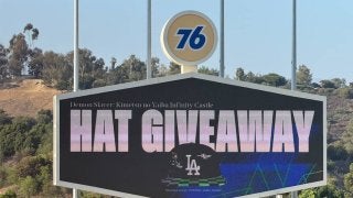 8月15日、ドジャースは『鬼滅の刃』とのコラボで特製キャップ(HAT)を試合来場者に無料配布した photo by Ok…