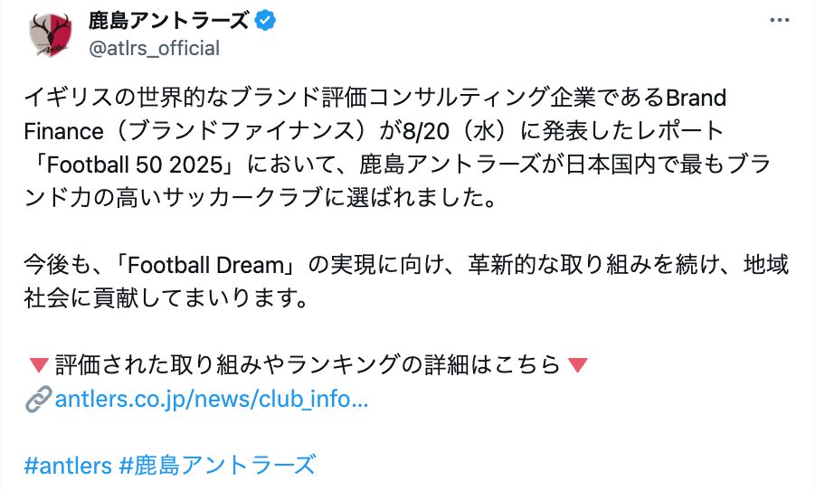 鹿島アントラーズが国内トップ評価、世界的ブランド調査で“最もブランド力の高いクラブ”に選出 | 話題の投稿