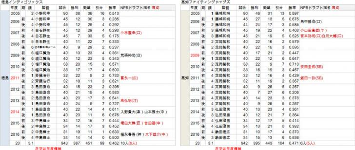 高知ファイティングドッグスはリーグ発足当初は強豪チームだった。2006年は今年のパ・リーグの首位打者、ロッテの角中勝也を擁して、前後期ともに首位争いをしたが、以後低迷。