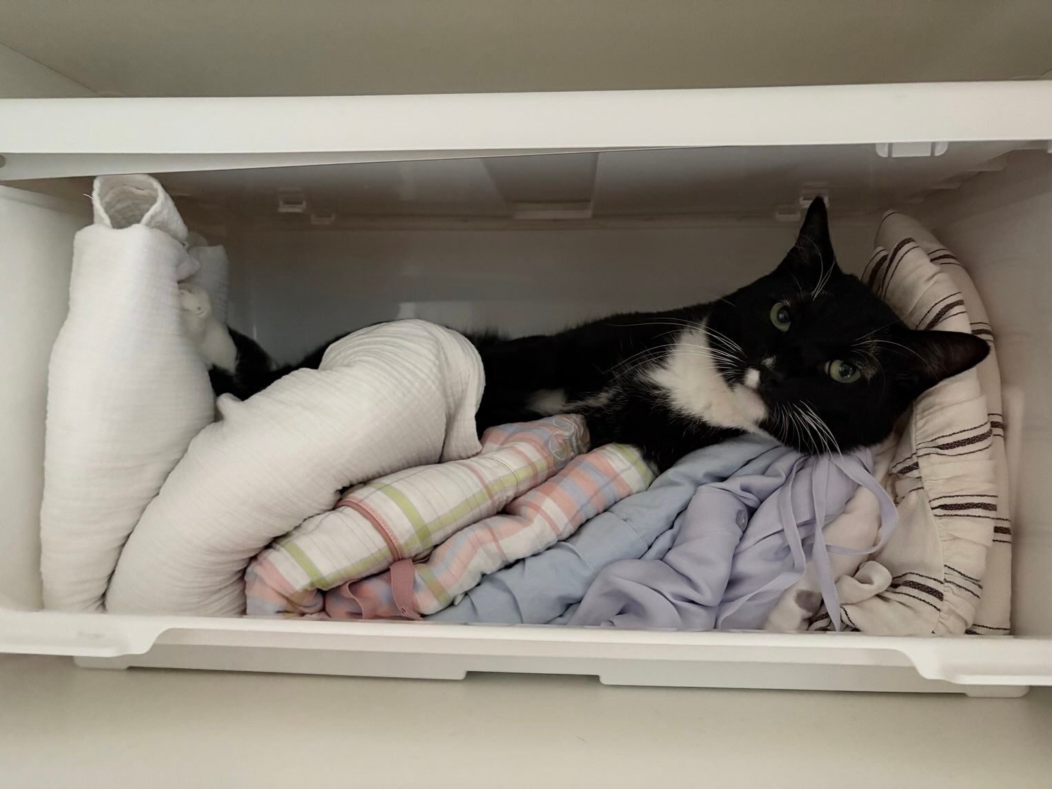 藤あや子の愛猫がパジャマゾーンを占拠!?ふかふかのパジャマたちを寝床に優雅なくつろぎ | 話題の投稿