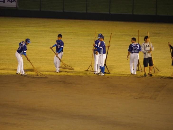 しかし独立リーグではグランドの整備も自分たちでやる。試合では5回が終了すると、ユニフォーム姿の選手たちがトンボを使ってグランドの土を慣らしている。