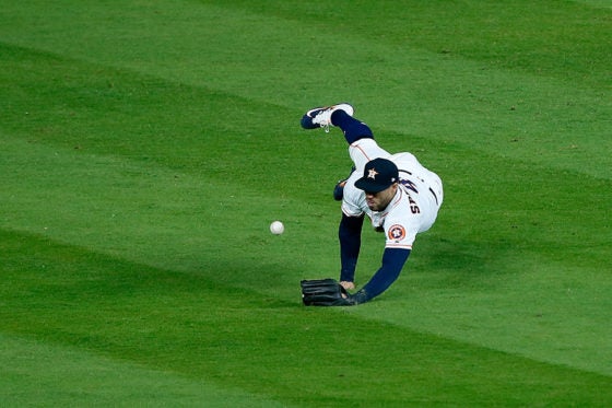 相手のミスに救われた。同点で迎えた7回、先頭ターナーが中堅フェンス直撃の二塁打で出塁するも、続くヘルナンデスが送りバントに失敗し、1死一塁となった。ここでベリンジャーが放った打球は、低い弾道を描いて中堅へ。この打球に対し、好守で知られるアストロズ中堅スプリンガーがジャンピングキャッチを試みようと果敢に飛び込んだ。だが、打球はスプリンガーのグラブから約20センチ手前でバウンドし、中堅奥へ転がった。