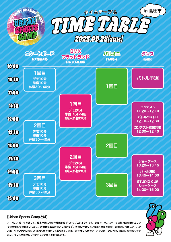 2025年9月28日(日)静岡県島田市駅前駐車場にて「URBAN SPORTS CAMP in SHIMADA」が開催され、スケートボード、BMX、パルオニ、ダンスのパフォーマンスや体験会が実施される。