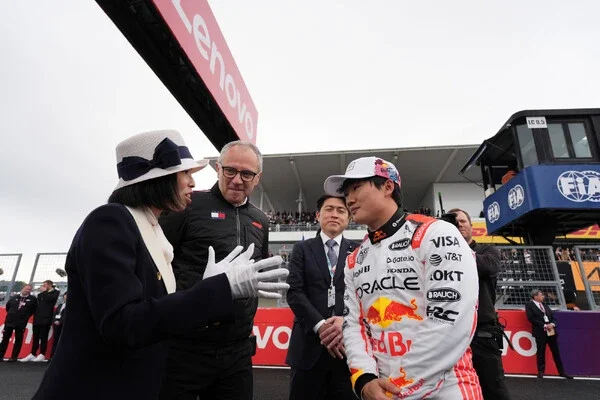 第3戦日本GP「レッドブルのデビュー戦となった日本GPの角田。特別カラーの白いレーシングスーツに身を包み、スタート前にF1の会長兼CEOを務めるステファノ・ドメニカリと三笠宮彬子女王殿下と談笑していました」(撮影/桜井淳雄)