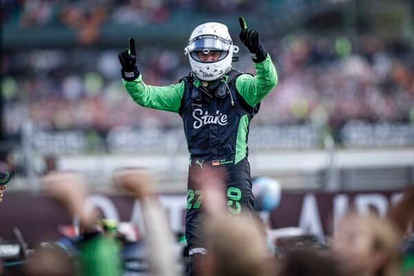 第12戦イギリスGP「F1出走239戦目にして初めての表彰台を獲得し、喜びを爆発させるニコ・ヒュルケンベルグ。この瞬間は彼やザウバー(ステーク)の人間だけでなく見ているファンもうれしかったと思います。しかも地元のハミルトンをやっつけて表彰台ですから、僕も感激しましたね」(撮影/熱田護)