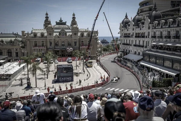 第8戦モナコGP「観客席から撮影したモンテカルロ市街地コースの名物カジノ・コーナー。コース脇には大型のクレーン車とともに多数のマーシャルと消防士が待機し、アクシデントに備えています。クレーン車とカジノの建物の奥に見えるのは地中海です」(撮影/熱田護)