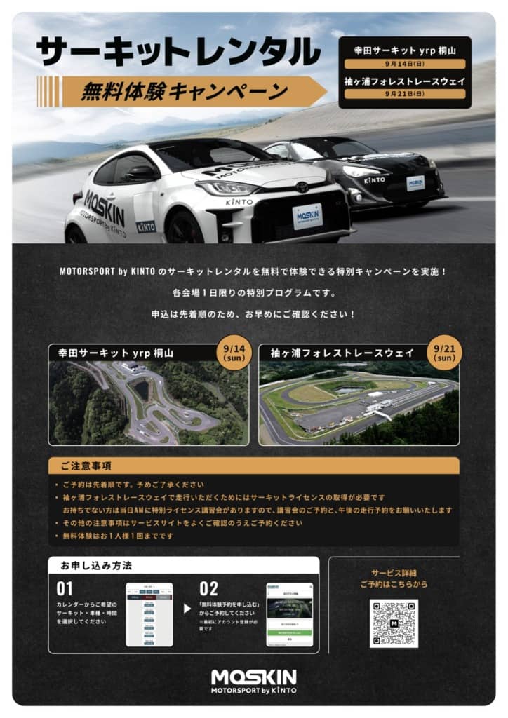 トヨタ車・レクサス車・スバル車のサブスクリプションサービスを展開しているKINTOの新サービス「MOTORSPORT by KINTO(MOSKIN)」が、サーキットレンタルを無料で体験できる特別キャンペーンを実施する。