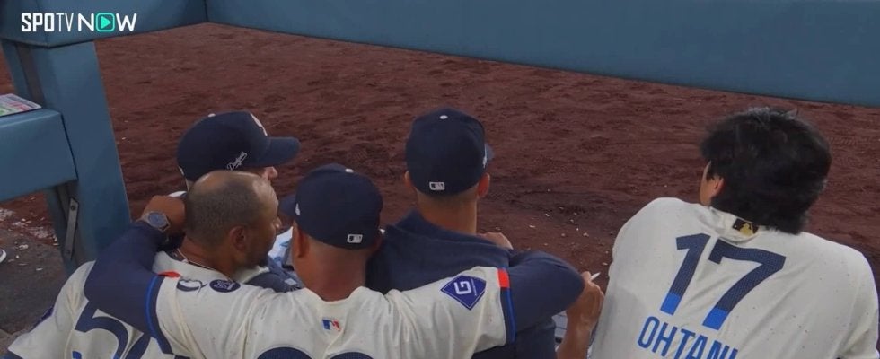 この様子を見た視聴者はSNS上で「どんなアドバイスをしたのかな?」「せまくね?」「ハグハグ会議」「ゲキを飛ばしたのかな?」とドジャースベンチの様子に興味津々だった。