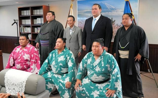 14日に始まる大相撲9月場所を前に、伊勢ケ浜部屋に所属する5人の力士が1日、鈴木康友知事を表敬訪問した。伊勢ケ浜親方(元横綱照ノ富士)と鈴木知事は、照ノ富士時代に知事が後援会の顧問を務めていた縁がある。