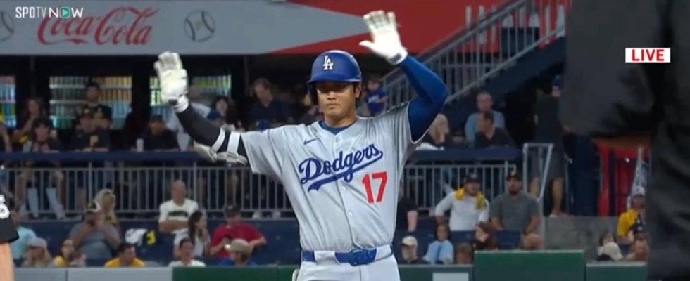 体調不良で突然の先発回避となったドジャースの大谷翔平が「1番・DH」でパイレーツ戦に出場。5回の第3打席で、鮮やかなツーベースヒットを放ちファンを驚かせた。