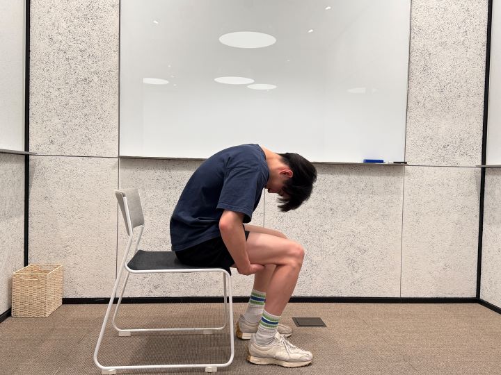 3)背中全体を丸め、首も力を抜いて下げる