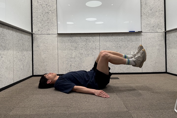 2)両脚を上げて、股関節と膝がともに90度になるように曲げる