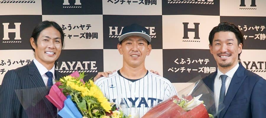 DeNAや巨人で活躍した梶谷隆幸氏が5日、静岡県のちゅ~るスタジアム清水で行われたくふうハヤテ、田中健二朗投手の引退会見にサプライズで登場し、花束を手渡した。DeNA時代に共闘した石川雄洋氏とともに駆けつけた梶谷氏はDeNA時代の後輩のために都内から約2時間運転して駆けつけた思いを語った。
