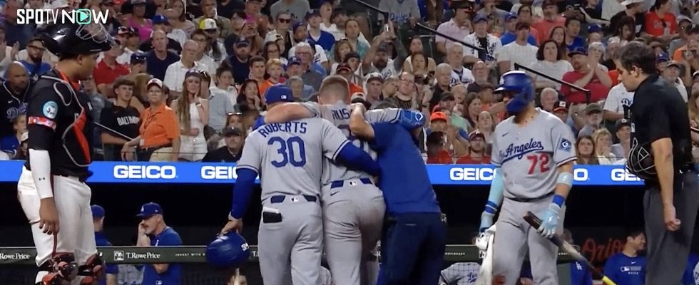 ド軍激震! ラッシングの負傷退場に大谷翔平も沈痛な面持ち ロバーツ監督の肩を借りダグアウト奥へ…球団は“打撲”と発表、捕手離脱相次ぐ