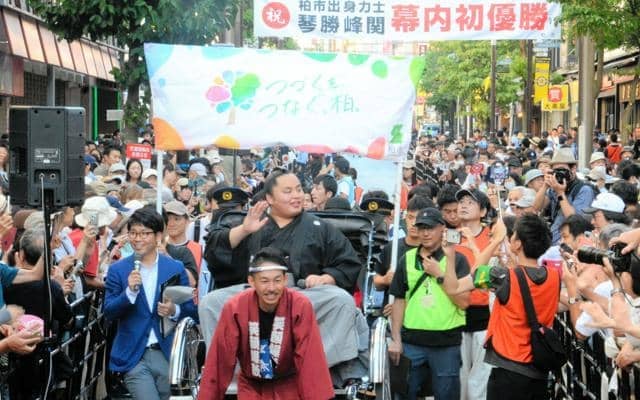終了後、琴勝峰関は観客を前に「また柏を盛り上げるため、がんばる」と、今後の活躍を誓った。長女とパレードを訪れていた茨城県取手市の主婦、成嶋知子さん(55)は「ぜひ、横綱をめざしてほしい」と期待した。