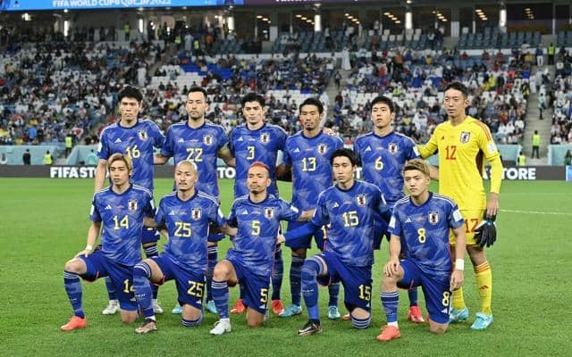 ワールドカップカタール大会決勝トーナメント1回戦のクロアチア戦に臨む日本代表の選手たち。先発のピッチには大学サッカーを経由した長友佑都(前列中央)や伊東純也(同左端)、谷口彰悟(後列左から3人目)、守田英正(同4人目)の4人が立った=2022年12月5日