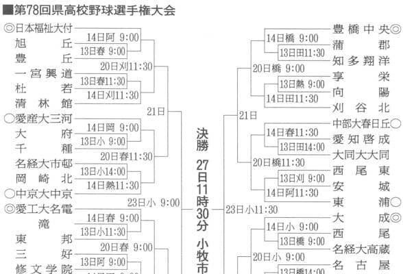第78回愛知県高校野球選手権大会(県高野連主催)の組み合わせ抽選会が9日、刈谷市内であり、参加49校の対戦相手が決まった。大会は13日に始まり、上位3校は来春の選抜大会の出場校選考につながる東海地区大会(10月18日開幕、刈谷球場ほか)に出場する。