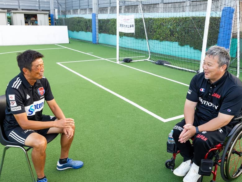 パラスポーツの中でも高い人気を誇る団体球技の指導者が初対面した。車いすバスケットボール男子日本代表の京谷和幸ヘッドコーチ(HC)と、ブラインドフットボール(ブラインドサッカー)男子日本代表の中川英治監督。京谷HCはJリーグ、中川監督は北海道1部リーグとそれぞれトップレベルのサッカーのプレー経験があり、ともにサッカー指導者ライセンスも持つ。サッカーと深く関わってきた2人だからこそ語れる、サッカーとそれぞれの競技の共通点と魅力とは。