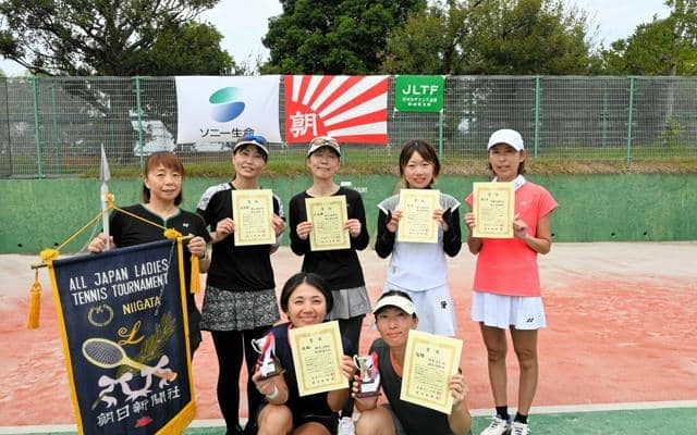 ソニー生命カップ第47回全国レディーステニス新潟県大会(日本テニス協会・朝日新聞社主催、ソニー生命保険特別協賛)は9日、新潟市東区の市庭球場で決勝戦と3位決定戦があった。阿部愛子さん・相馬沙季さん組が優勝。2位は遠山麻美さん・横山由紀江さん組、3位は中村亜紀さん・金子真佑佳さん組だった。