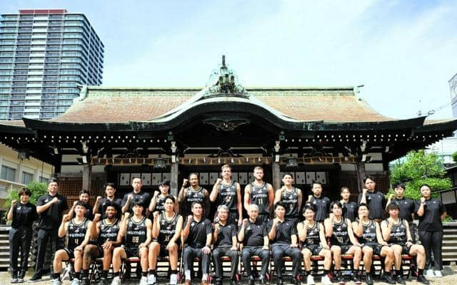 男子プロバスケットボールBリーグ1部(B1)の大阪エヴェッサの選手らが10日、大阪市浪速区の今宮戎神社で必勝祈願し、10月から始まる新たなシーズンでの飛躍を誓った。