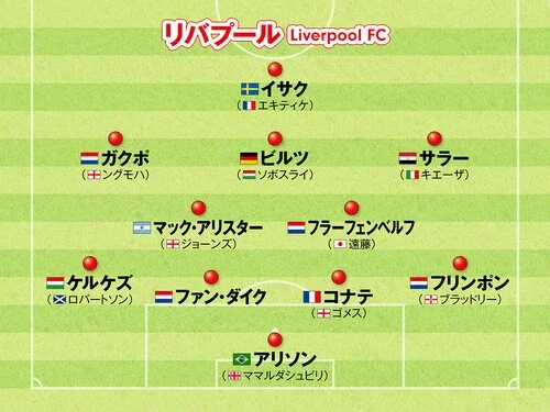 MF:フロリアン・ビルツ(ドミニク・ソボスライ)、アレクシス・マック・アリスター(カーティス・ジョーンズ)、ライアン・フラーフェンベルフ(遠藤航)