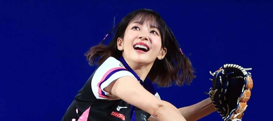 【画像】スカートお構いなし…“役満ボディー”岡田紗佳さん、スカートひらりの豪快投球