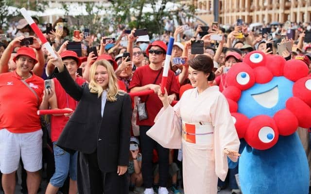 日本館とフランス館の間を、赤い服を着たボランティア約220人が手を取り合ってつなぐ、「赤い糸」をテーマにした催しもあり、中間点では両館を代表して藤原紀香さんと仏俳優レア・セドゥさんがバトンを交換した。(渡邊萌々香)