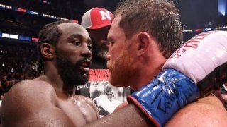 試合後にカネロ(右)と言葉を交わすクロフォード(左)(C)Getty Images 前人未到の大記録が生まれた。 現地時…