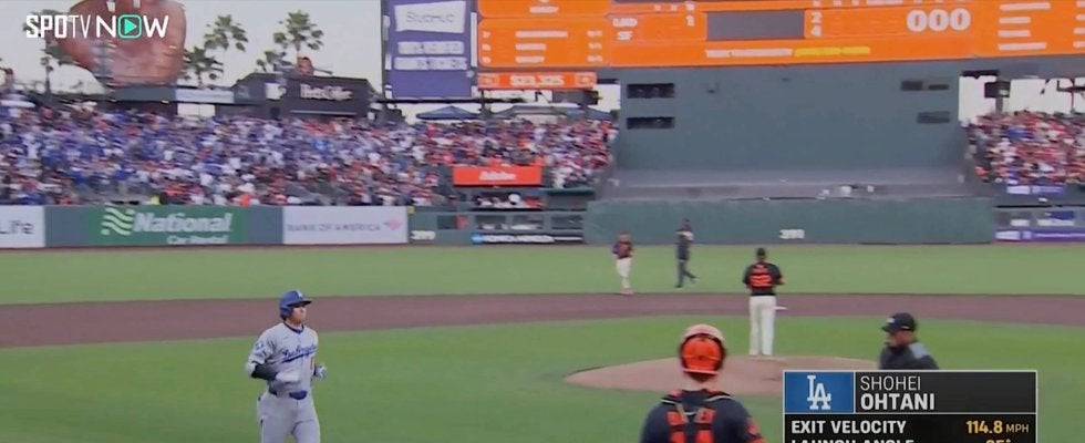 打球角度25度で打ち上がった打球は、着弾までわずか約3秒。この日SPOTV NOWで実況を務めた生明辰也アナウンサーが「もうセンターも見送っている。打った瞬間でしたセンター方向。見事なバッティングを見せました」と伝えたように、114.8マイル(約184.8キロ)という超高速打球がバックスクリーンへと吸い込まれた。打った大谷が仁王立ちで本塁打を確信して見とれていると、ジャイアンツナインもこれは届かないとあきらめムード。中でも打球に最も近いセンターのマトスは早々と諦めていた。