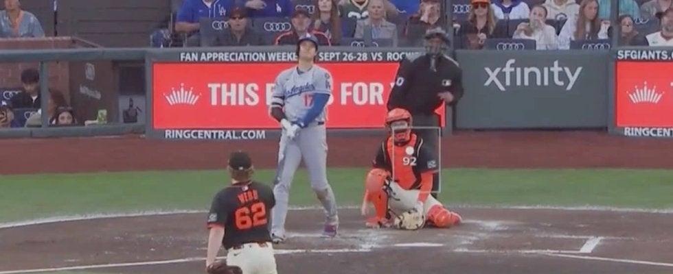 1-4、ドジャース3点のビハインドの3回表・ドジャースの攻撃。この回先頭で迎えた1番・大谷の第2打席、この打席で大谷は、ジャイアンツ先発のローガン・ウェブに対して初球、外角低めのボール球を見送ってカウント1-0とした上で、2球目、真ん中やや内寄り、高めへと投じられた148km/hのシンカーを高々と打ち上げると、打球はそのまま高速でセンター方向へと伸び上がり続ける特大の飛球に。すると、マウンド上のウェブは、即座に被弾を確信したのか、すべてを悟ったように肩を落とすと、打球方向を振り返ることなくマウンド上で佇むことに。その間も打球は伸び続け、時速114.8マイル(約184.75km/h)で瞬く間にセンターバックスクリーンへと着弾。大谷の今季49号は、好投手に“秒で確信させる”文句なしの豪快弾となった。こうした大谷の一発と、ウェブの“被弾リアクション”にファンからは「エグいな」「打球見てない」「確信早すぎ」「動けない」「ピッチャー息してる?」「これは泣くだろ」といった様々な反響が巻き起こることに。