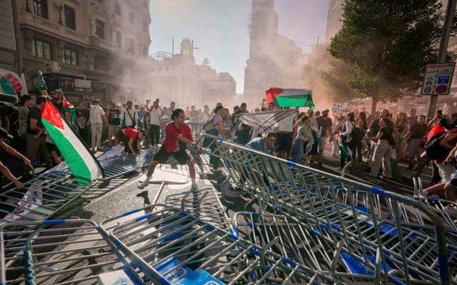 スペインの首都マドリードで14日に開催された自転車ロードレース「ブエルタ・ア・エスパーニャ」で、パレスチナ自治区ガザの人道危機を訴えるデモ隊がコースに侵入してレースが中止となった。地元当局によると、この日同市内で開かれた抗議デモには10万人が参加したという。