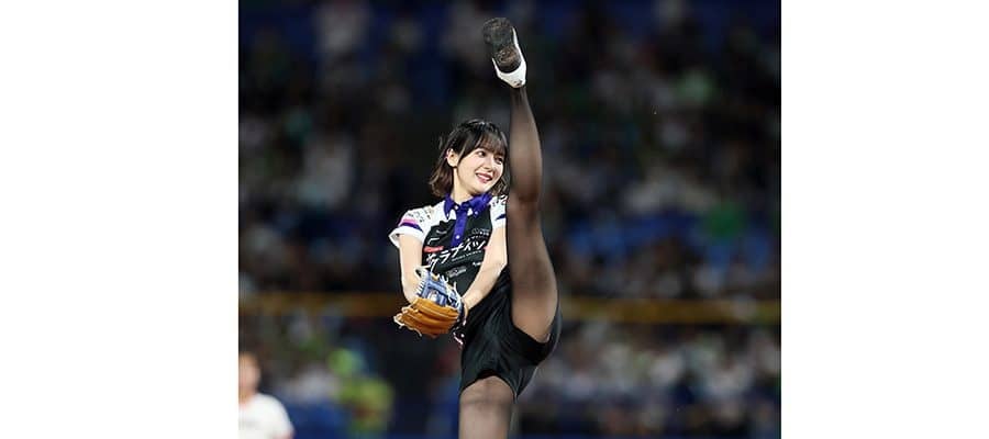 【動画】スカートお構いなし…女子アナの頭より高い“超豪快足上げ”始球式