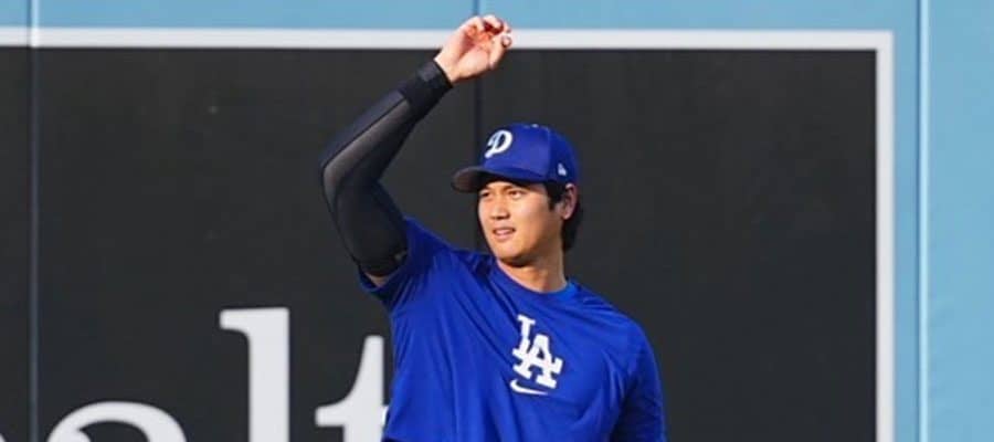 試合前にキャッチボールを行うドジャース・大谷翔平【写真:荒川祐史】