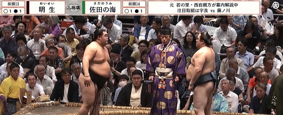 明生と佐田の海の取組に懸けられた懸賞は8本。そのうち5本が「ナカタケナカタケ家具はナカタケ」で、5回連続で「ナカタケナカタケ……」と、まるで早口言葉のように連呼されることになった。担当した行司は思わず噛みそうになりながらなんとか読み終え、館内からは笑いが沸き起こった。